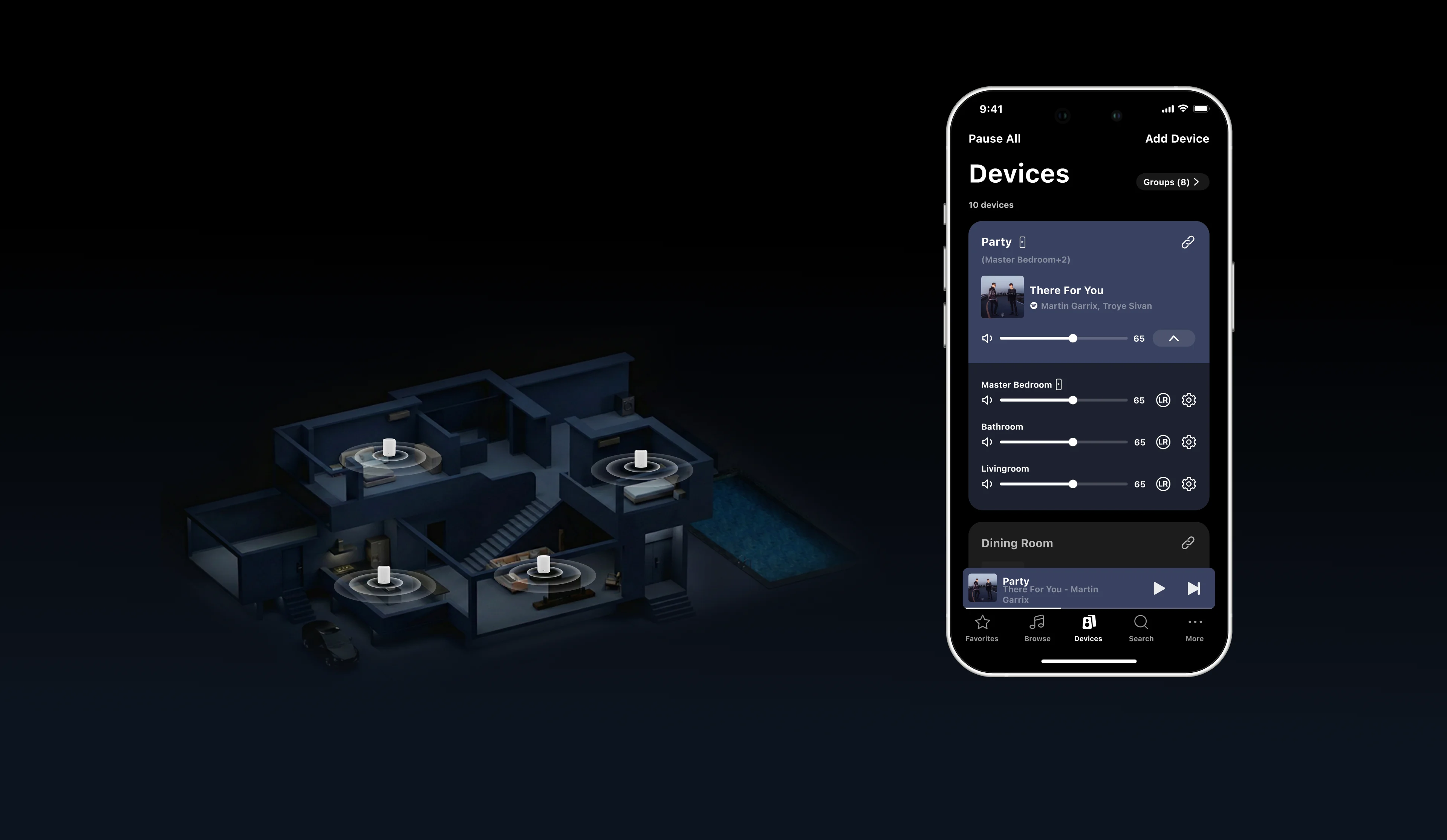 Jokainen huone synkassa, Ryhmitä kaiuttimia, synkkaa musiikki huoneesta toiseen tai luo oma tunnelma joka tilaan. Hallitse toistoa ja äänenvoimakkuutta huonekohtaisesti WiiM Home -sovelluksessa ja jaa myös ulkoiset sisääntulot joka huoneeseen.